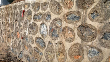 01 本土特色 康旅創(chuàng)新 井陘村落內(nèi),常用砌筑毛石擋墻的方法為“虎皮紋”工藝,即首先用石頭壘砌擋墻的基本結(jié)構(gòu),再用砂漿、水泥抹平不同石頭之間的縫隙。在這種工藝下成形的擋墻,從外表看來,米黃色的不規(guī)則石頭鑲嵌在灰色之間,紋理似虎皮形狀,故名“虎皮紋”。 而在洛陽村景觀石墻的建造過程中,作為項目經(jīng)理的他積極踐行董事長劉江敏“因地制宜,就地取材”的宏觀指導,對“虎皮紋”進行改良,在村落人居環(huán)境改造與提升的過程中突出“本土特色”,留下“康旅創(chuàng)新”,展示“康旅服務”。 村莊內(nèi)隨處可見的虎皮紋工藝 改良后的擋墻砌筑工藝,多了一份質(zhì)樸與靈動 02 改變千篇一律的習慣 在擋墻砌筑上,項目經(jīng)理在完成壘砌毛石的第一步工序后,并未選擇以填充砂漿的常規(guī)方法處理縫隙,而是從村落內(nèi)直接取材一些清拆后剩余的碎石、鵝卵石勾入石縫中,再加水泥、砂漿等一起抹平。從外表看上去,較大的石塊中央摻雜著形狀各異、紋理豐富、色澤不一的小石和鵝卵石,縫隙填充飽滿,結(jié)實,在一眾“虎皮紋”墻面中顯示出獨有的特色。