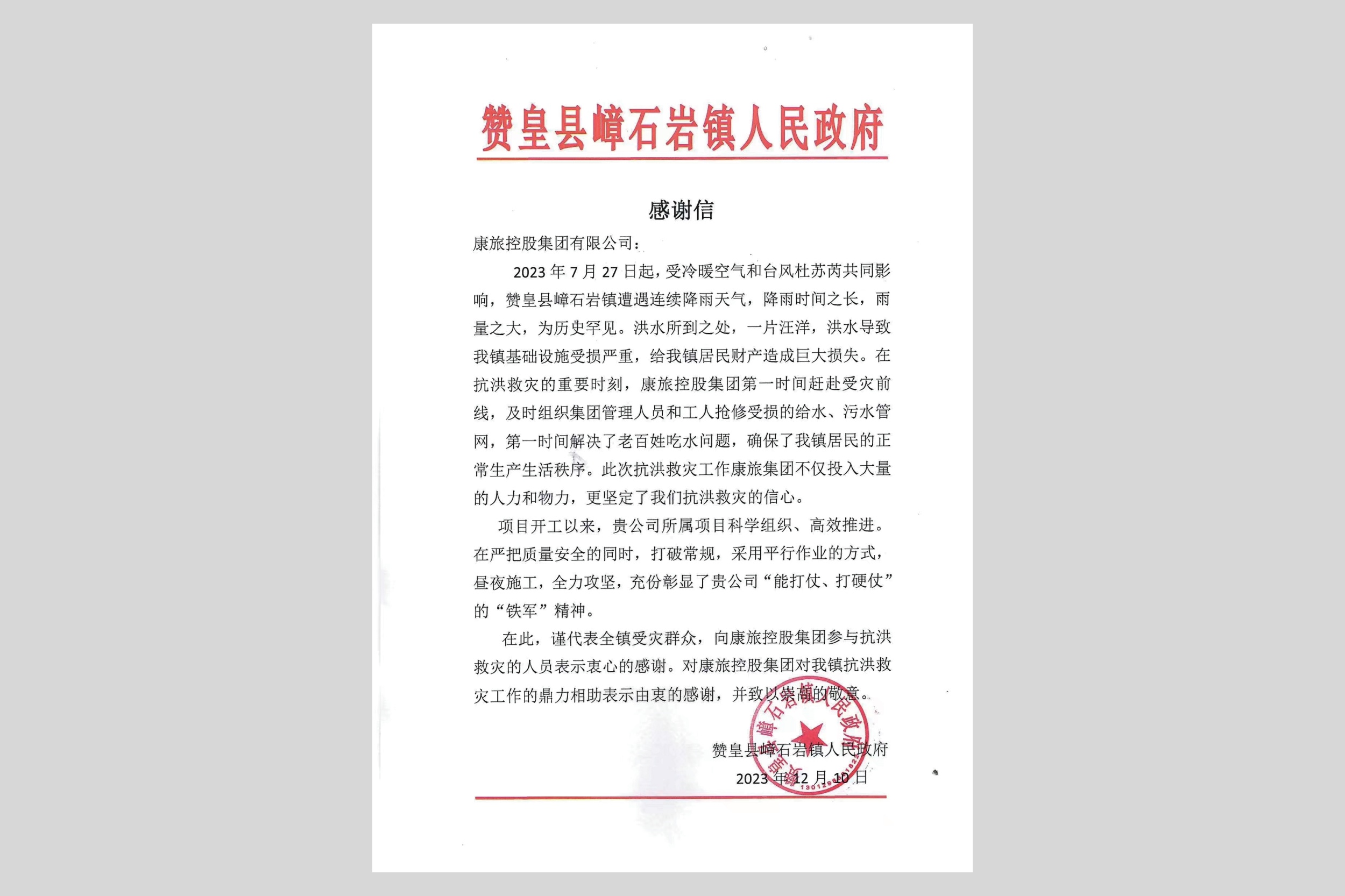 趕赴贊皇受災(zāi)前線,抗洪救災(zāi),收到贊皇縣嶂石巖鎮(zhèn)人民政府發(fā)來的感謝信