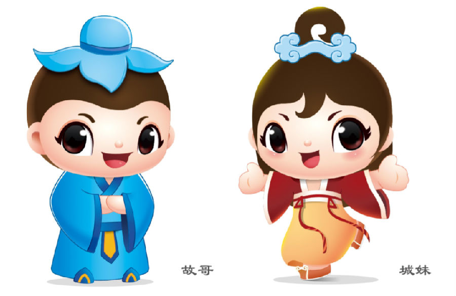 吉祥物“故哥”、“城妹”,代表著故城縣的董子文化與運(yùn)河文化。“故哥”詮釋董子文化,其形象為儒家學(xué)子,身著漢服,執(zhí)古代士相見(jiàn)禮,低頭微笑作揖,展現(xiàn)了故城縣崇禮重教的文化傳統(tǒng)?!俺敲谩闭蔑@運(yùn)河文化,發(fā)型如“運(yùn)河第一灣”,發(fā)飾為由浪花組成的如意形態(tài);眉毛形似柳葉,代表非物質(zhì)文化遺產(chǎn)“掃洪柳”;城妹身著紅色系漢服,彰顯故城千年文化底蘊(yùn)。兩個(gè)吉祥物外表秀美、身形飄逸,凸顯故城兒女的熱情好客。