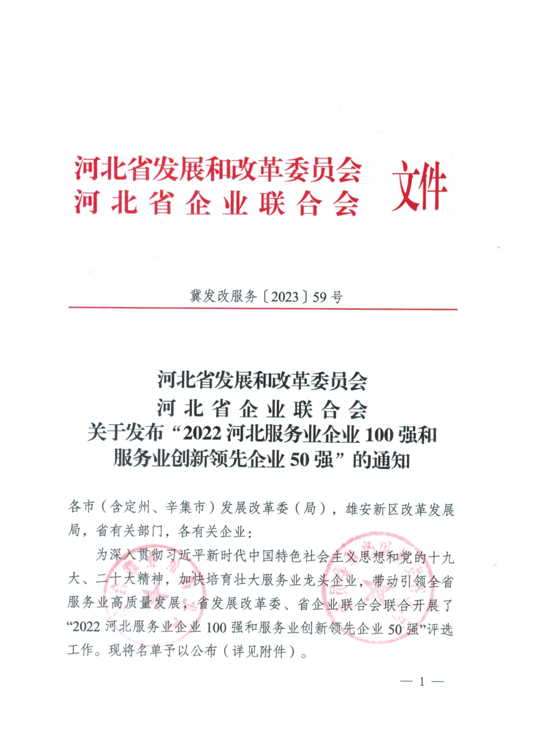 1月17日,河北省發(fā)展改革委、省企業(yè)聯(lián)合會(huì)共同發(fā)布“2022河北服務(wù)業(yè)企業(yè)100強(qiáng)”名單,康旅控股集團(tuán)位列其中!再度蟬聯(lián)本榮譽(yù),充分體現(xiàn)了社會(huì)各界對(duì)集團(tuán)的高度認(rèn)可!